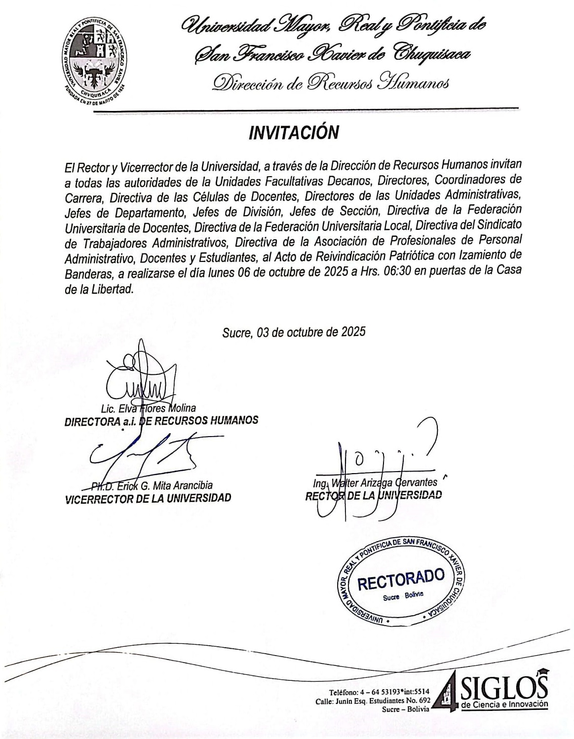 INVITACIÓN ACTO DE REIVINDICACIÓN PATRIÓTICA CON IZAMIENTO DE BANDERAS LUNES 06/10/2025. por pub_usr_rectorado | Oct 3, 2025 | Comunicados