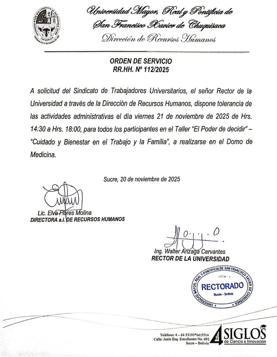 ORDEN DE SERVICIO RR.HH. Nº 112/2025, TOLERANCIA EN ACTIVIDADES ADMINISTRATIVAS, TALLER EL PODER DE DECIDIR-CUIDADO Y BIENESTAR, 21/11/2025. por pub_usr_rectorado | Nov 20, 2025 | Comunicados