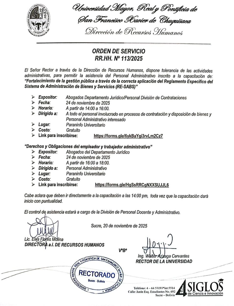 ORDEN DE SERVICIO RR.HH. Nº 113/2025, TOLERANCIA EN ACTIVIDADES ADMINISTRATIVAS, CAPACITACIÓN EN RE-SABS, DERECHOS Y OBLIGACIONES DEL EMPLEADOR Y TRABAJADOR 24/11/2025.