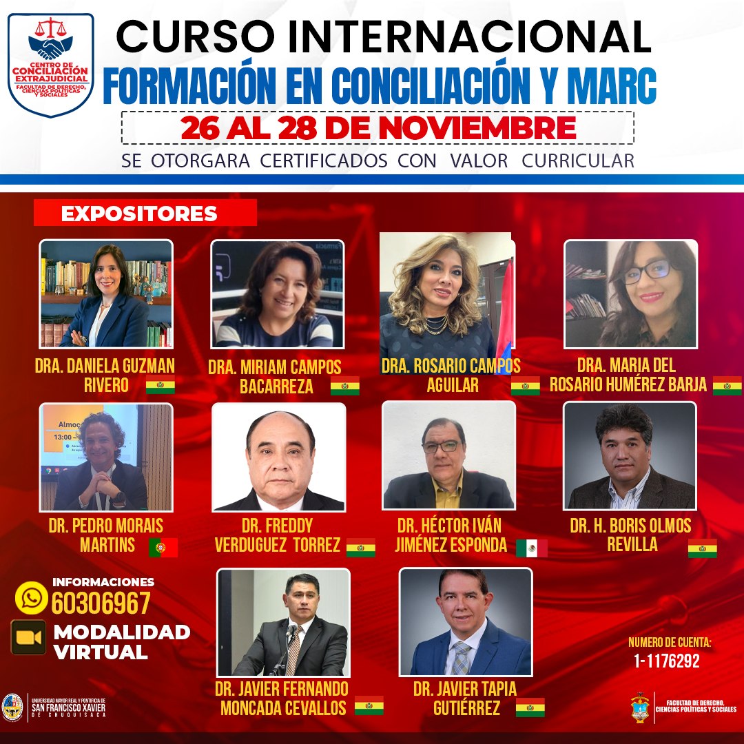 La Facultad de Derecho, Ciencias Políticas y Sociales invita a participar en el Curso de Conciliación, una formación especializada que contará con la presencia de destacados maestros internacionales y nacionales de amplia trayectoria.