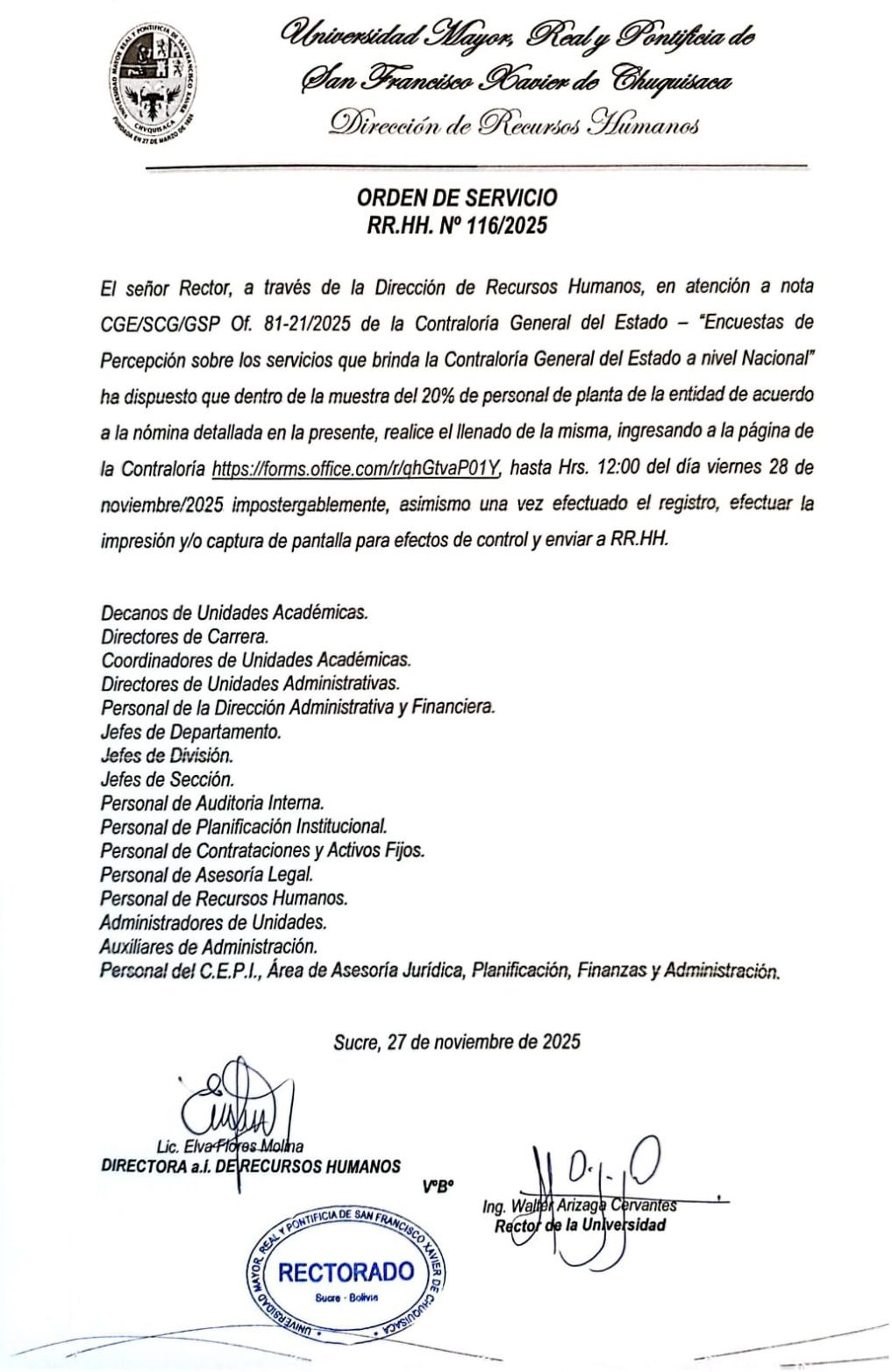 ORDEN DE SERVICIO RR.HH. Nº 116/2025, OBLIGATORIEDAD DEL LLENADO DE ENCUESTA CONTRALORIA GENERAL DEL ESTADO A NIVEL NACIONAL HASTA EL 28/11/2025. por pub_usr_rectorado | Nov 27, 2025 | Comunicados