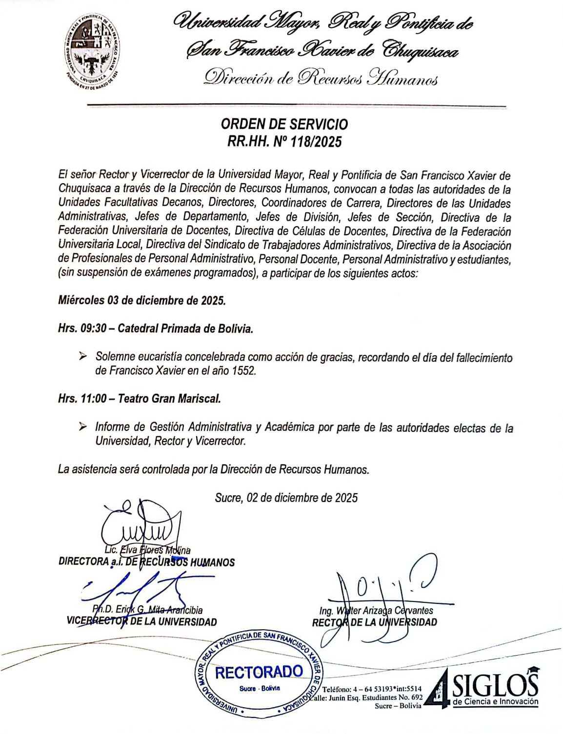 • ORDEN DE SERVICIO RR.HH. Nº 118/2025, SOLEMNE EUCARISTÍA DÍA DE FALLECIMIENTO FRANCISCO XAVIER E INFORME DE GESTIÓN 2025, 03/12/2025.