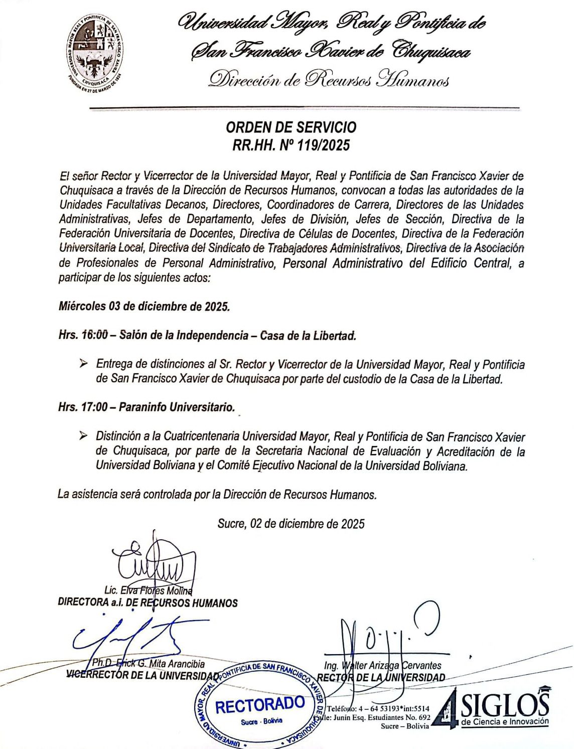 ORDEN DE SERVICIO RR.HH. Nº 119/2025, DISTINCIÓN A AUTORIDADES POR LA CASA DE LA LIBERTAD Y DISTINCIÓN A LA UMRPSFXCH POR EL CEUB 03/12/2025. por pub_usr_rectorado | Dic 2, 2025 | Comunicados