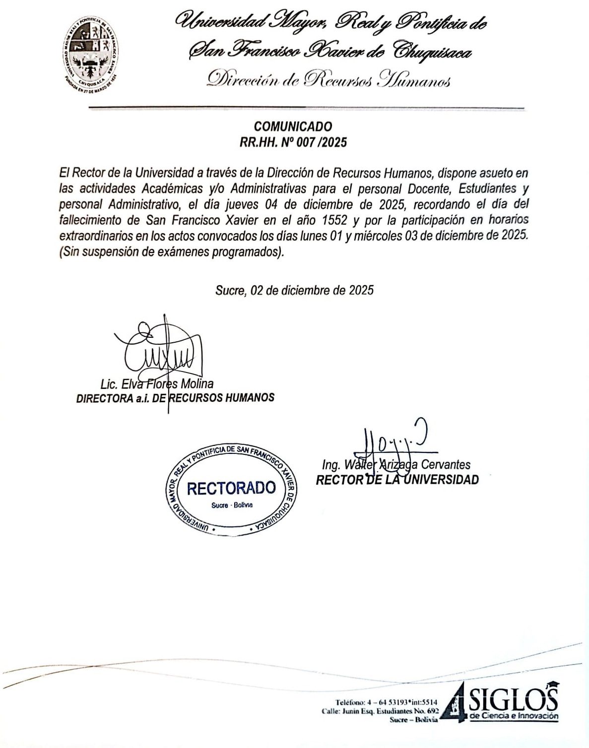 COMUNICADO RR.HH. Nº 007/2025, ASUETO EN ACTIVIDADES ACADÉMICAS Y ADMINISTRATIVAS EL 04/12/2025, EN HOMENAJE A LOS 1552 DEL FALLECIMIENTO DE SAN FRANCISCO XAVIER.