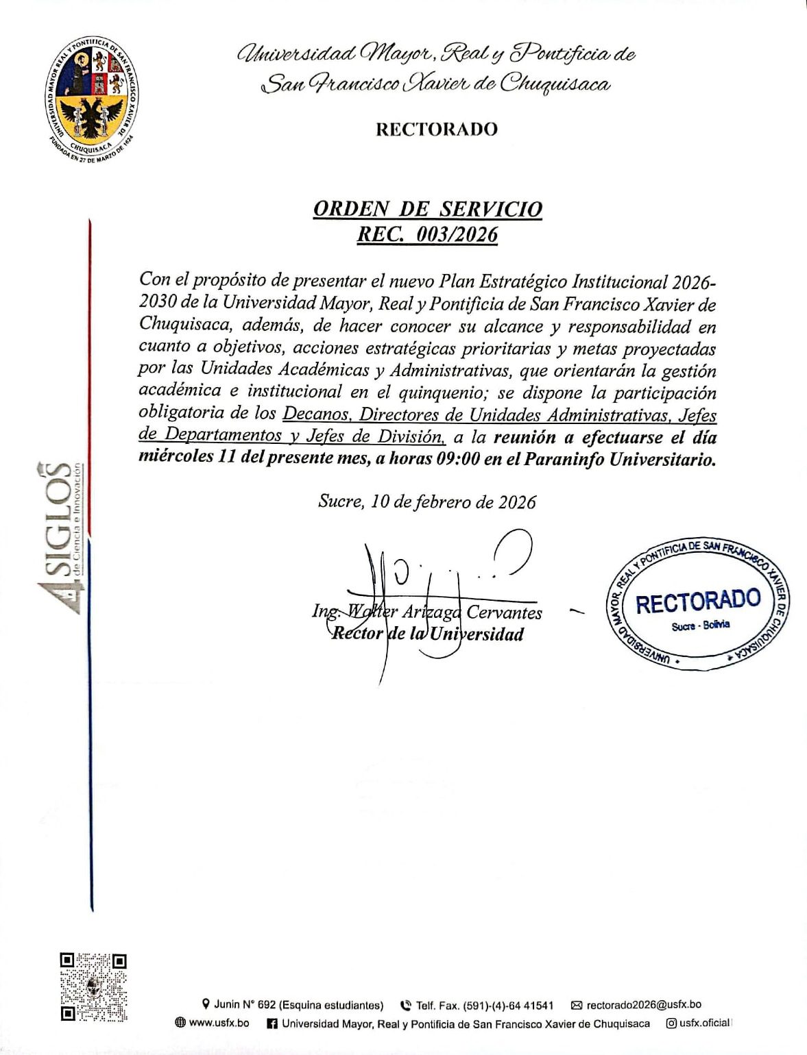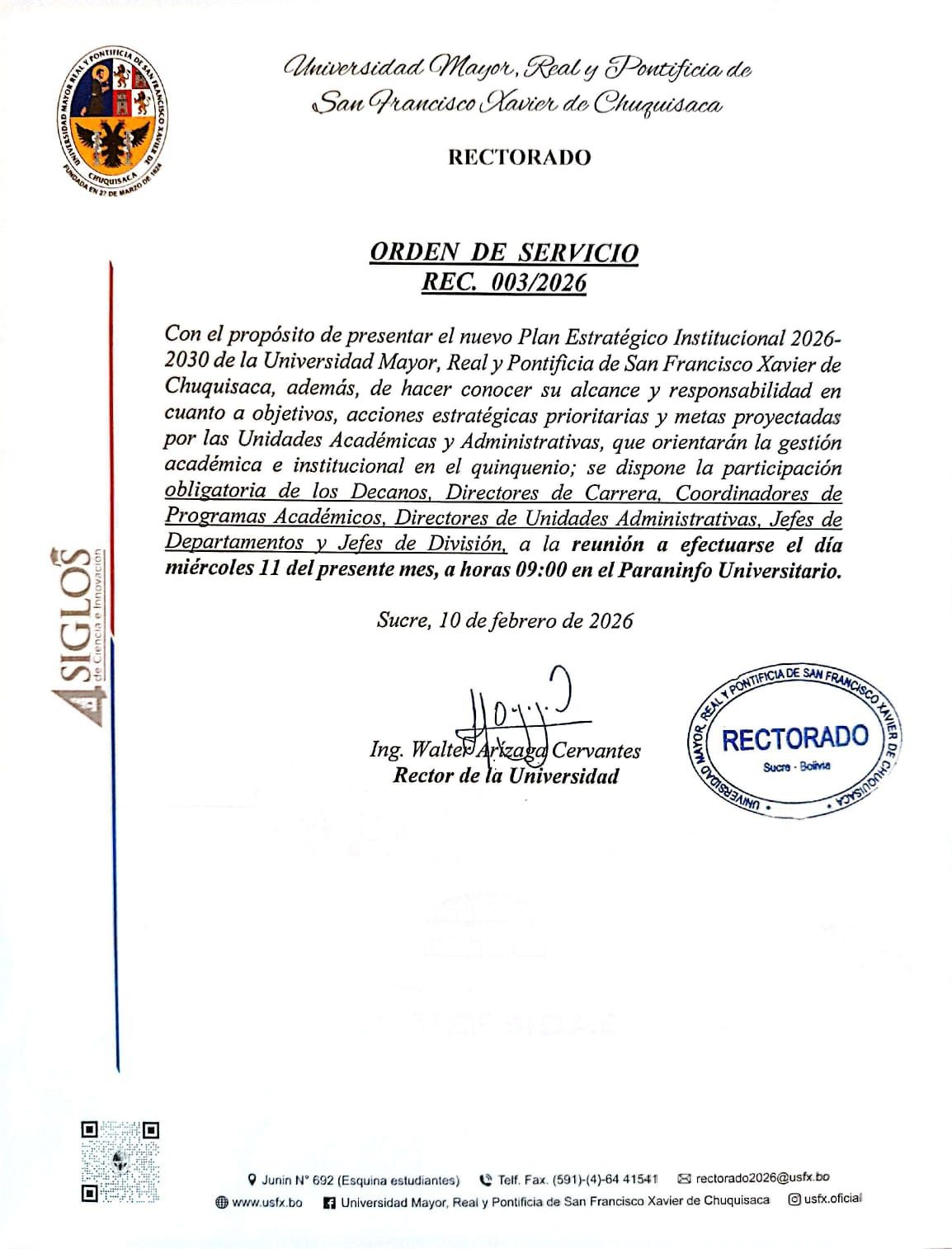 ORDEN DE SERVICIO RECTORAL. Nº 003/2026, PRESENTACIÓN DEL NUEVO PLAN ESTRATÉGICO INSTITUCIONAL 2026-2030 UMRPSFXCH 11/02/2026. por pub_usr_rectorado | Feb 10, 2026 | Comunicados