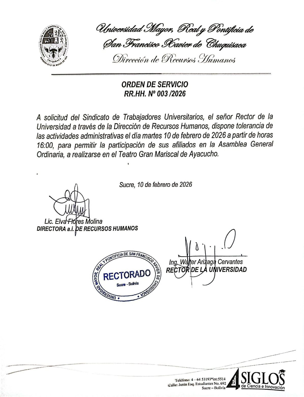 ORDEN DE SERVICIO RR.HH. Nº 003/2026, TOLERANCIA EN ACTIVIDADES ADMINISTRATIVAS POR ASAMBLEA STUSFX 10/02/2026. por pub_usr_rectorado | Feb 10, 2026 | Comunicados
