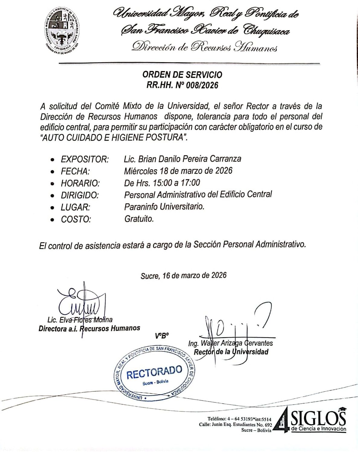 ORDEN DE SERVICIO RR.HH. Nº 008/2026, CURSO DE AUTO CUIDADO E HIGIENE POSTURA 18-03-2026 por pub_usr_rectorado | Mar 18, 2026 | Comunicados