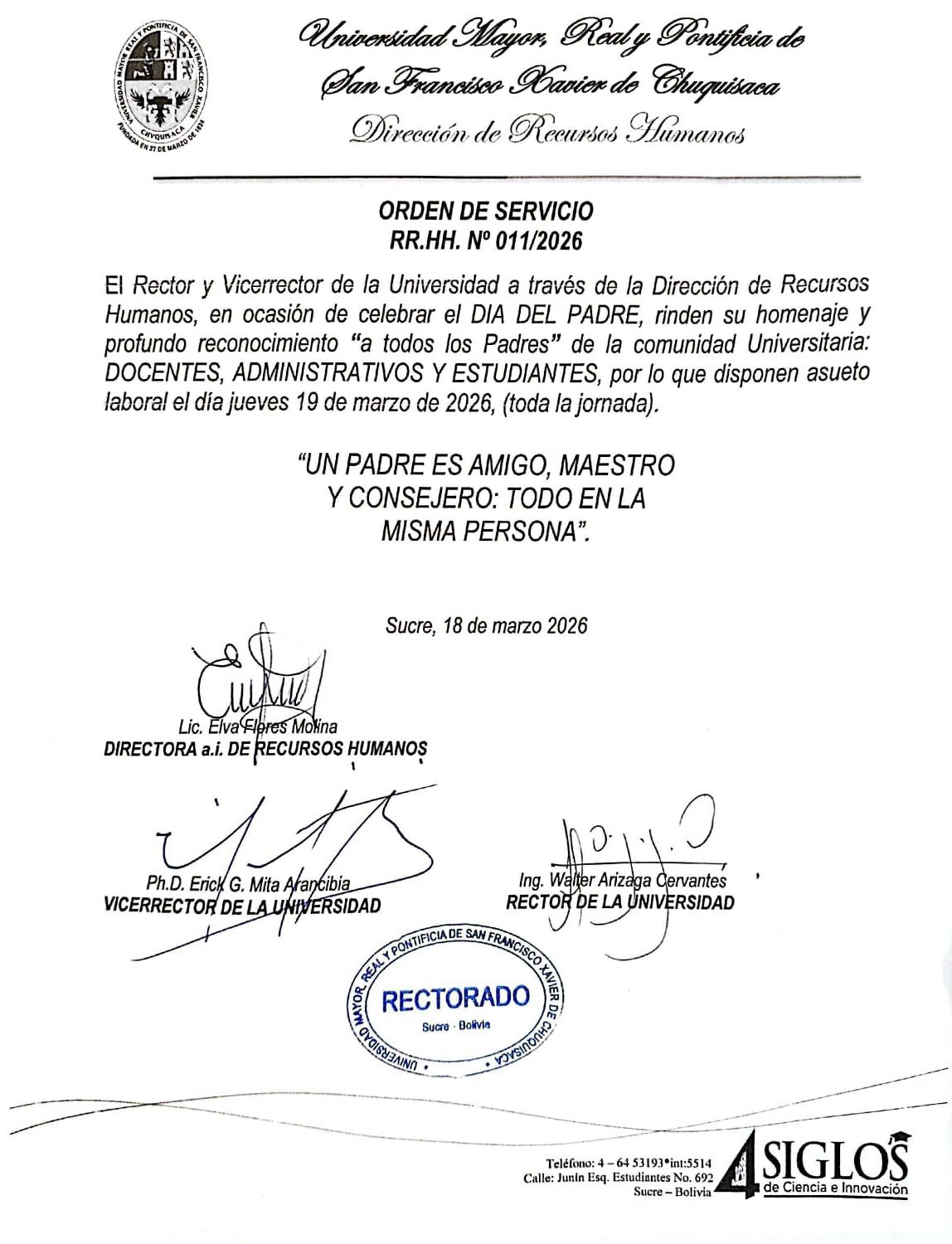 ORDEN DE SERVICIO RR.HH. Nº 011/2026, ASUETO LABORAL POR EL DÍA DEL PADRE 19 DE MARZO DEL 2026. por pub_usr_rectorado | Mar 18, 2026 | Comunicados