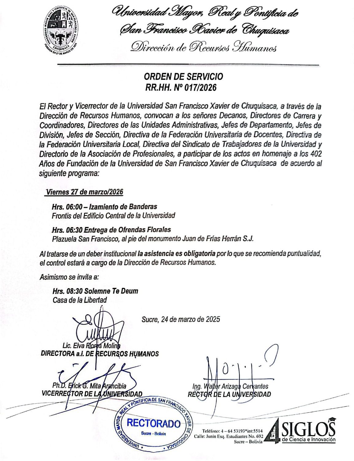 ORDEN DE SERVICIO RR.HH. Nº 017/2026, ACTOS EN HOMENAJE A LOS 402 DE FUNDACIÓN DE LA UMRPSFXCH, 27/03/2026.