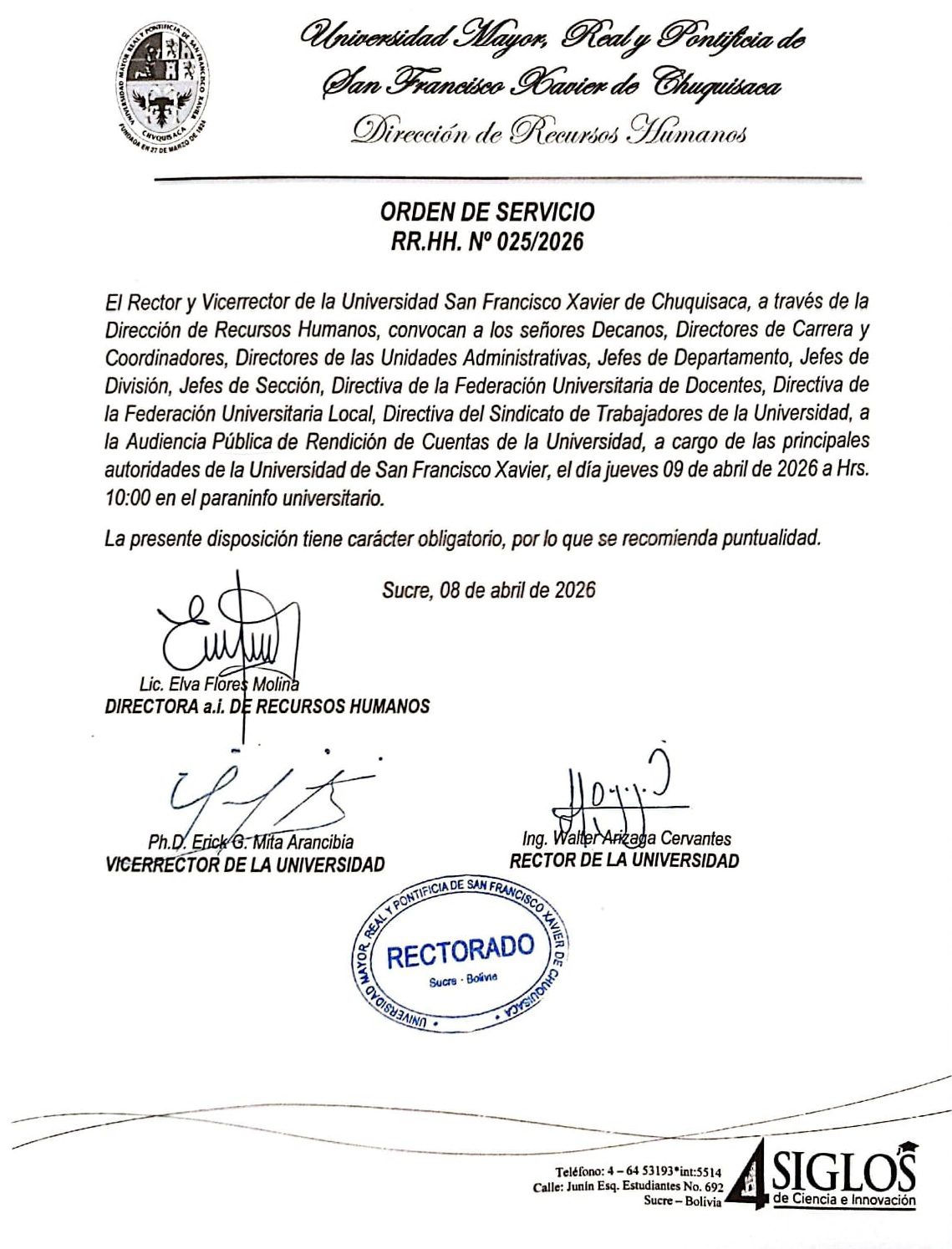 ORDEN DE SERVICIO RR.HH. Nº 025/2026, AUDIENCIA PÚBLICA DE RENDICIÓN DE CUENTAS DE LA UMRPSFXCH 2025, 09/04/2026.