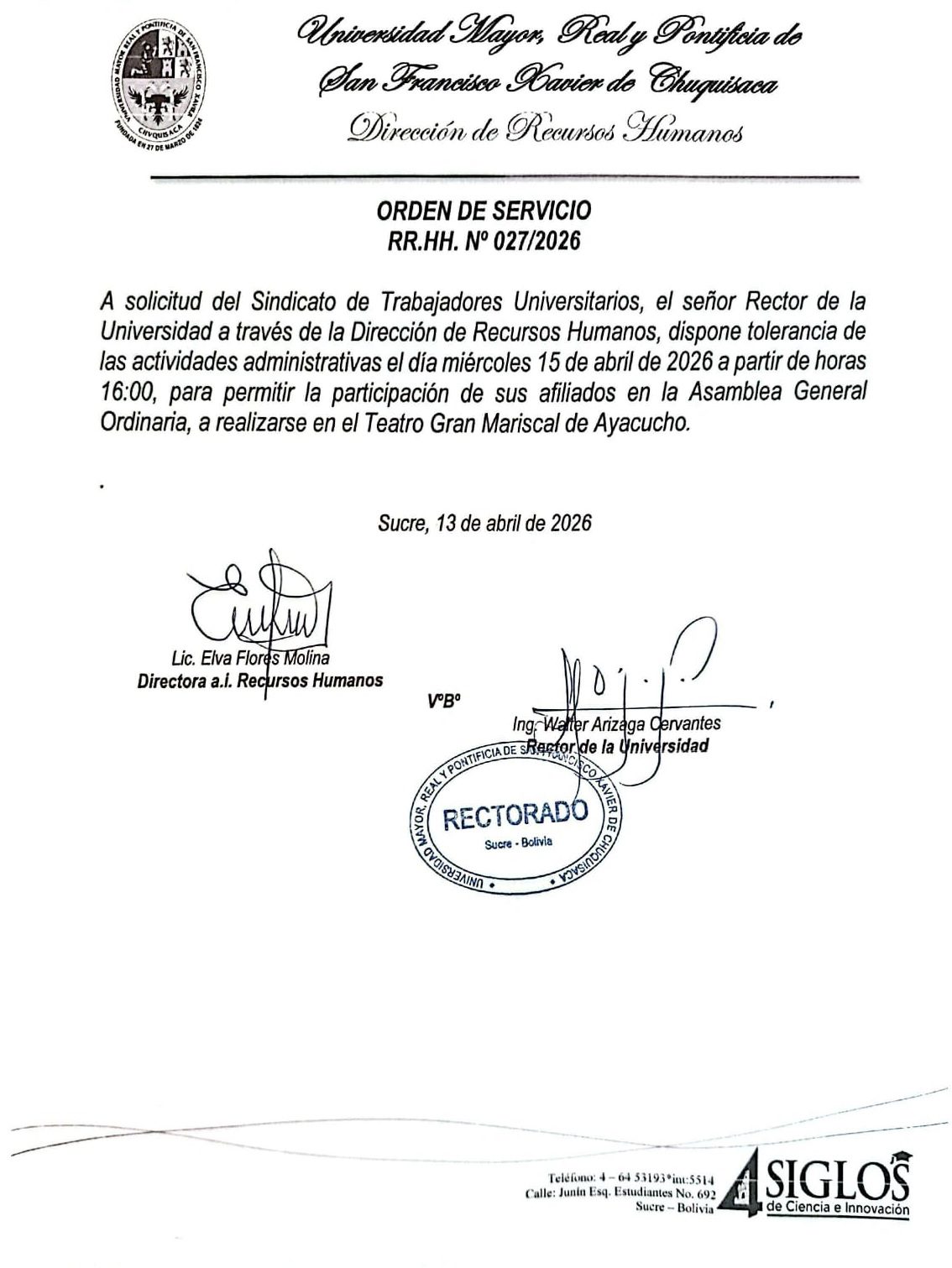ORDEN DE SERVICIO RR.HH. Nº 027/2026, TOLERANCIA EN ACTIVIDADES ADMINISTRATIVAS POR ASAMBLEA DEL STUSFX, 15/04/2026.