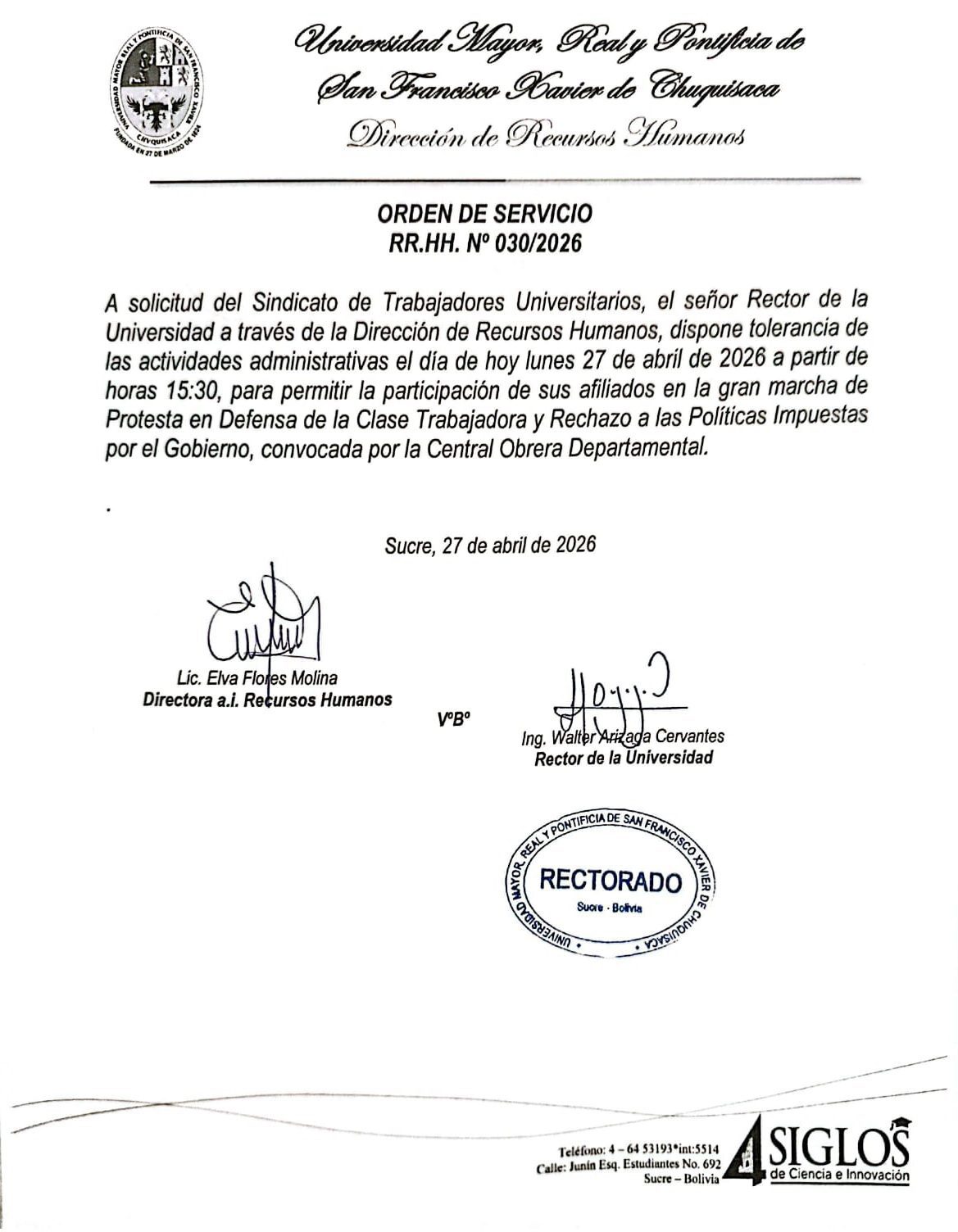 ORDEN DE SERVICIO RR.HH. Nº 030/2026, TOLERANCIA ACTIVIDADES ADMINISTRATIVAS, MARCHA CONVOCADA POR LA COB, 27/04/2026. por pub_usr_rectorado | Abr 27, 2026 | Comunicados