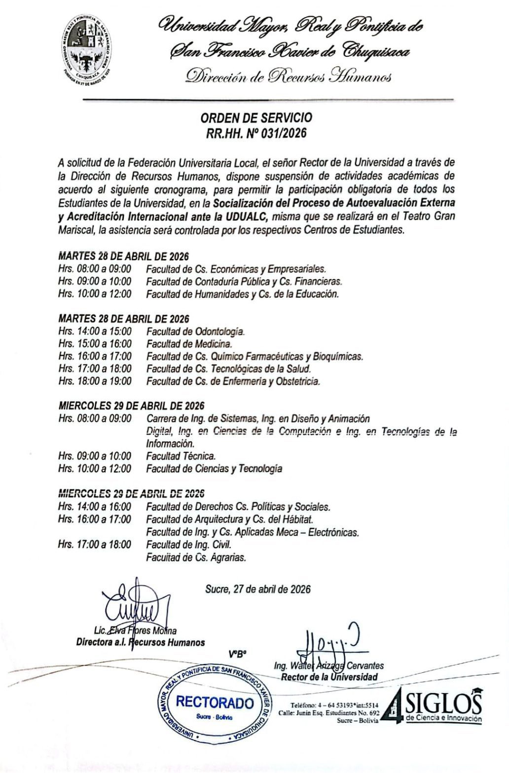 ORDEN DE SERVICIO RR.HH. Nº 031/2026, SUSPENSIÓN DE ACTIVIDADES ACADÉMICAS A SOLICITUD DE LA FUL, POR SOCIALIZACIÓN DE LA UDUALC 2026. por pub_usr_rectorado | Abr 27, 2026 | Comunicados