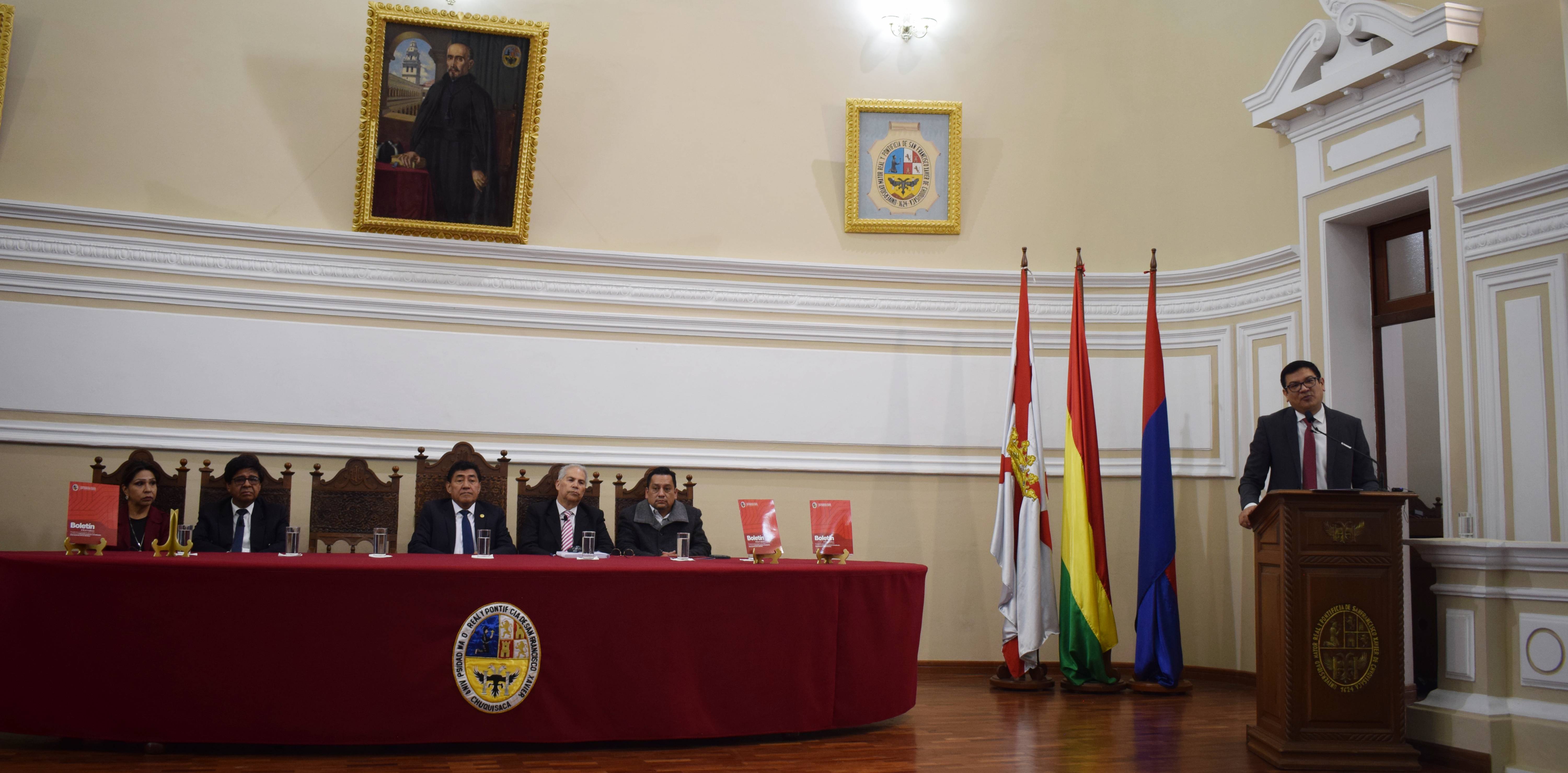 “Creemos que la Universidad tiene que estar presente en este tipo de eventos académicos de carácter histórico, ya que facilita que los historiadores prosigan sus investigaciones en procurar de fortalecer la memoria de nuestra sociedad; precisamente, este libro es el resultado de las investigaciones de destacados historiadores que gracias a la sociedad Geográfica y de Historia Sucre y la Universidad de San Francisco Xavier se ha logrado publicar este documento que representa el homenaje de ambas instituciones al bicentenario de Bolivia”, destacó el rector.