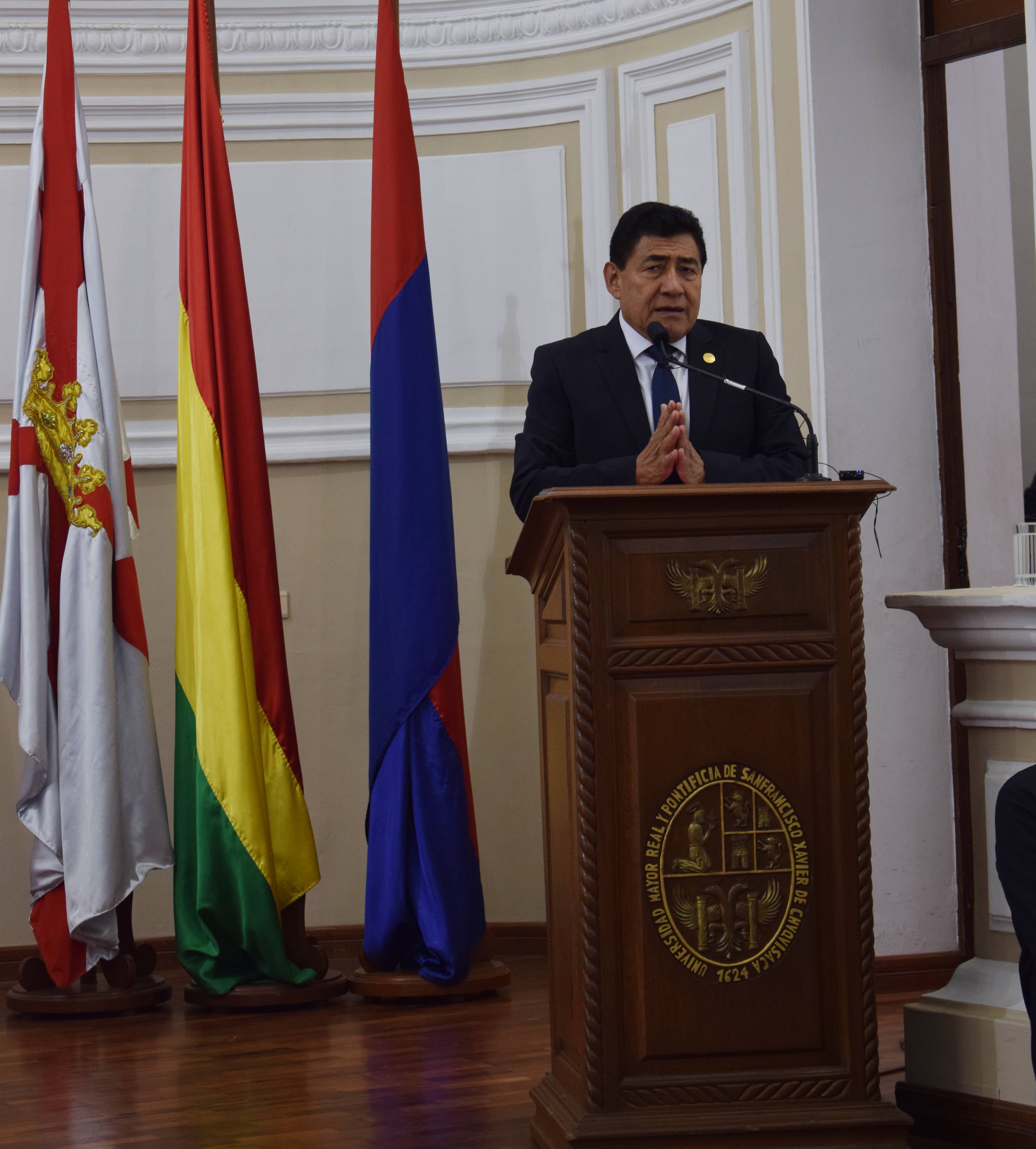 Desde el mismo enfoque, el rector, Walter Arízaga, destacó que el bicentenario de Bolivia representó la oportunidad para encaminar acciones concretas dirigidas a lograr la integración iberoamericana; de igual forma, subrayó sobre el papel decisivo que jugó la Universidad en el proceso independentista y su influencia en la fundación de Bolivia.