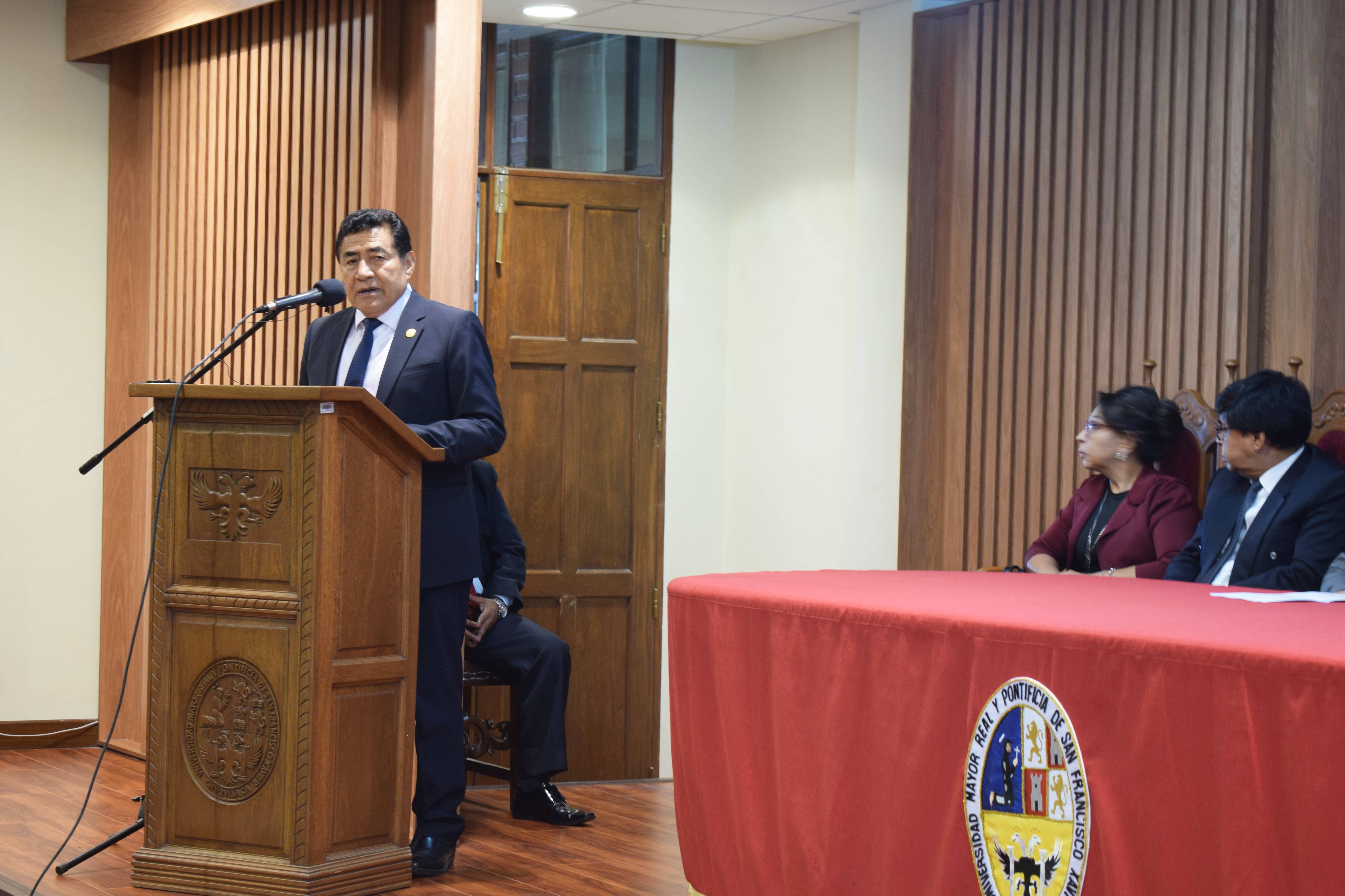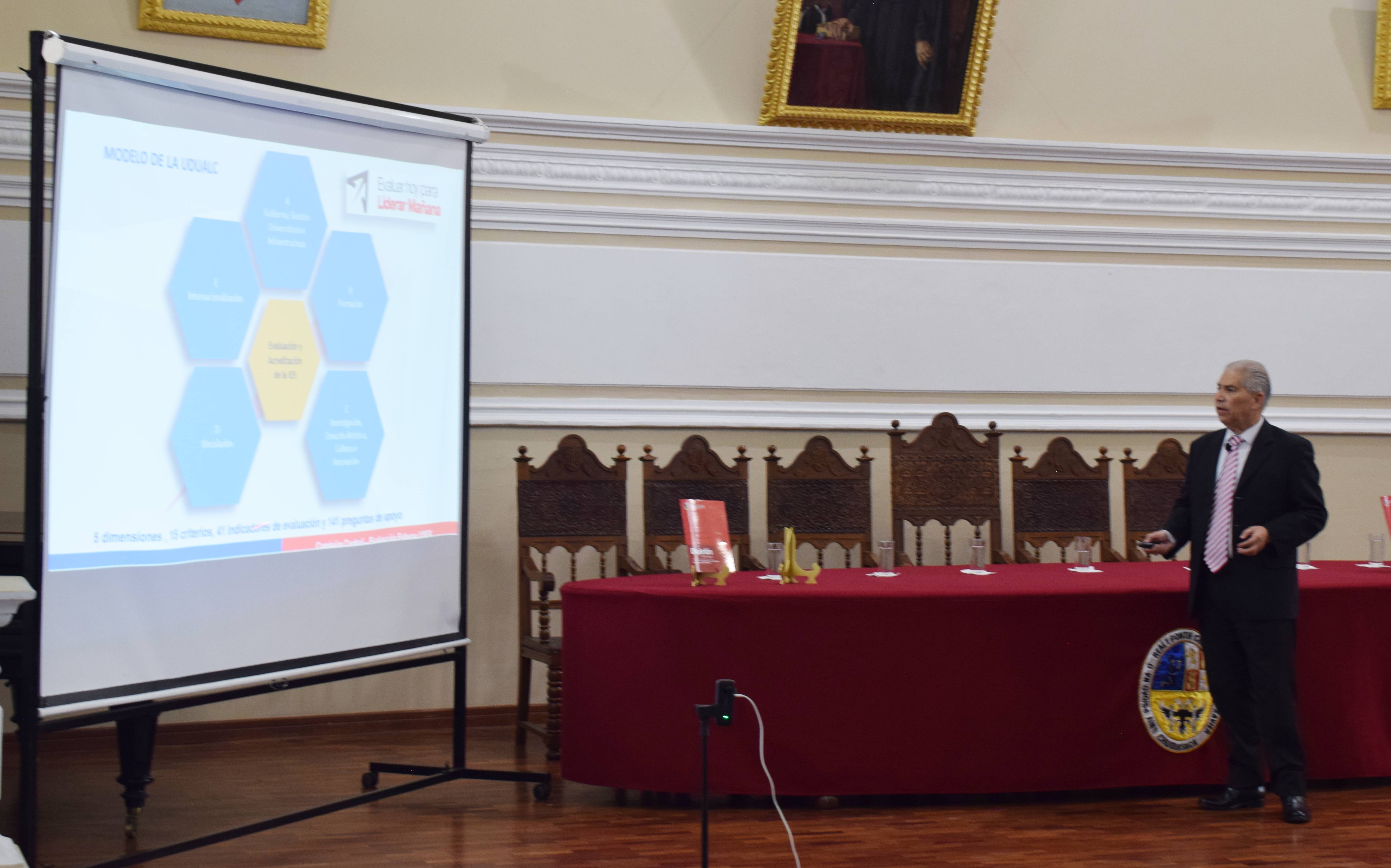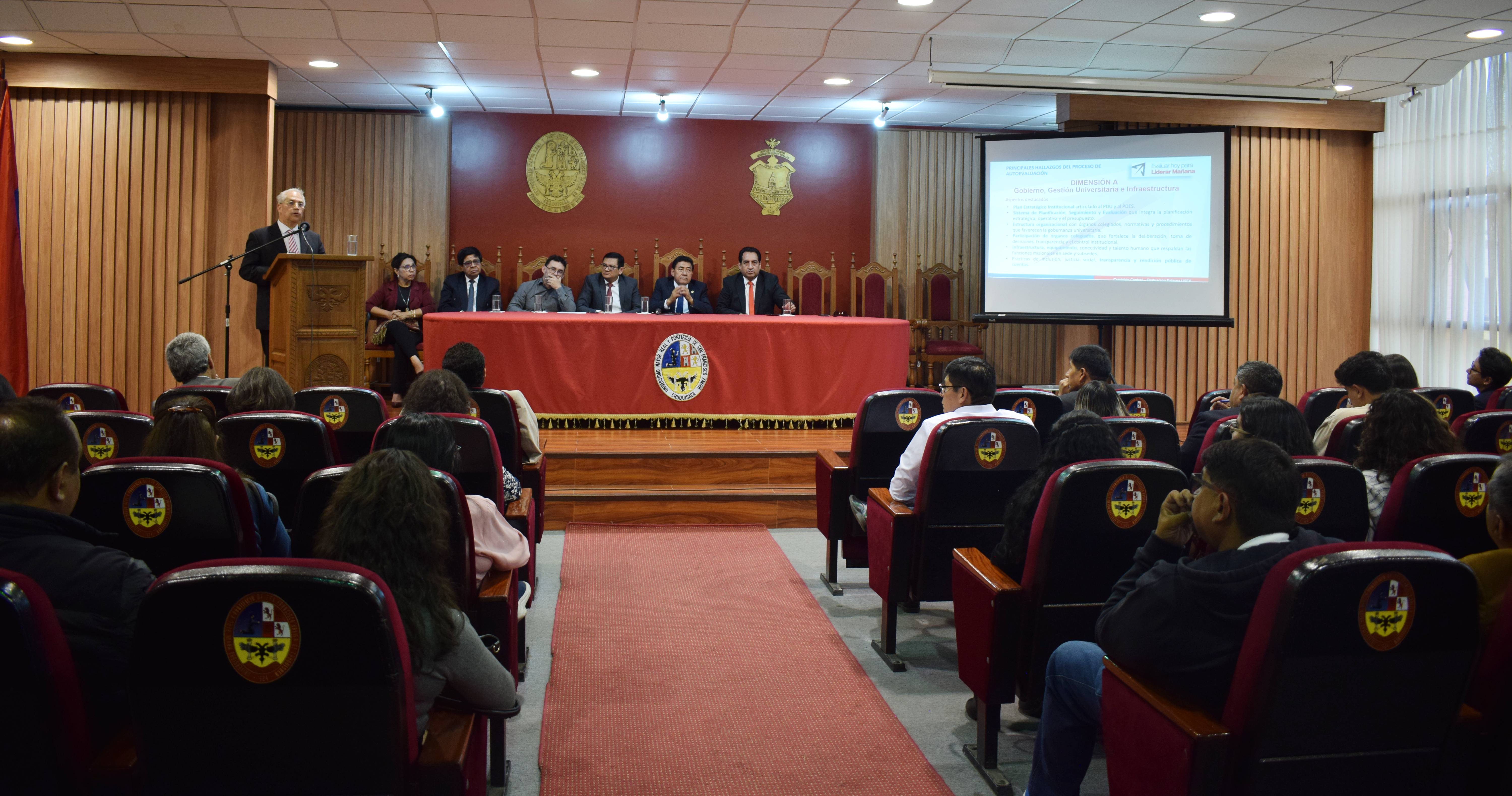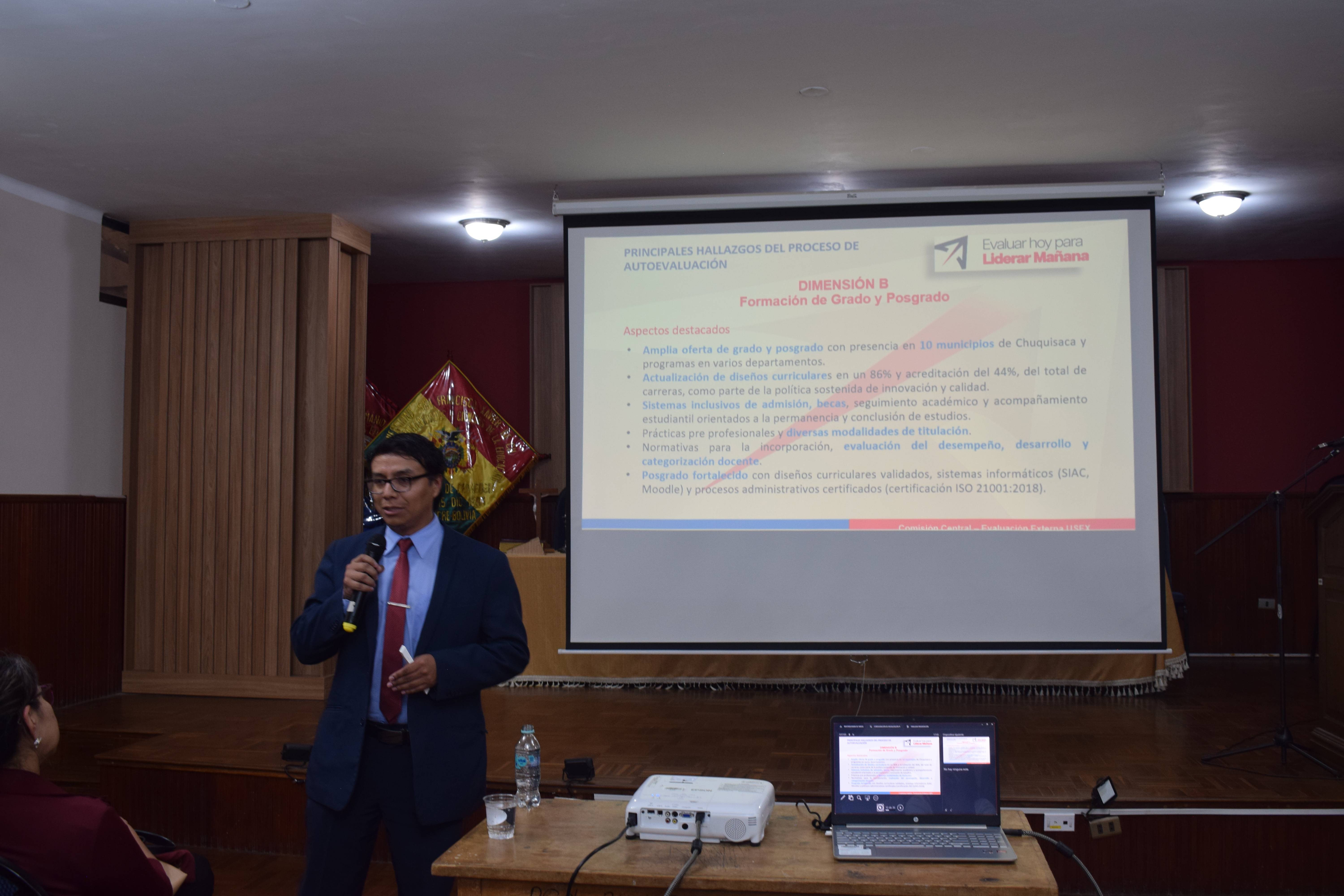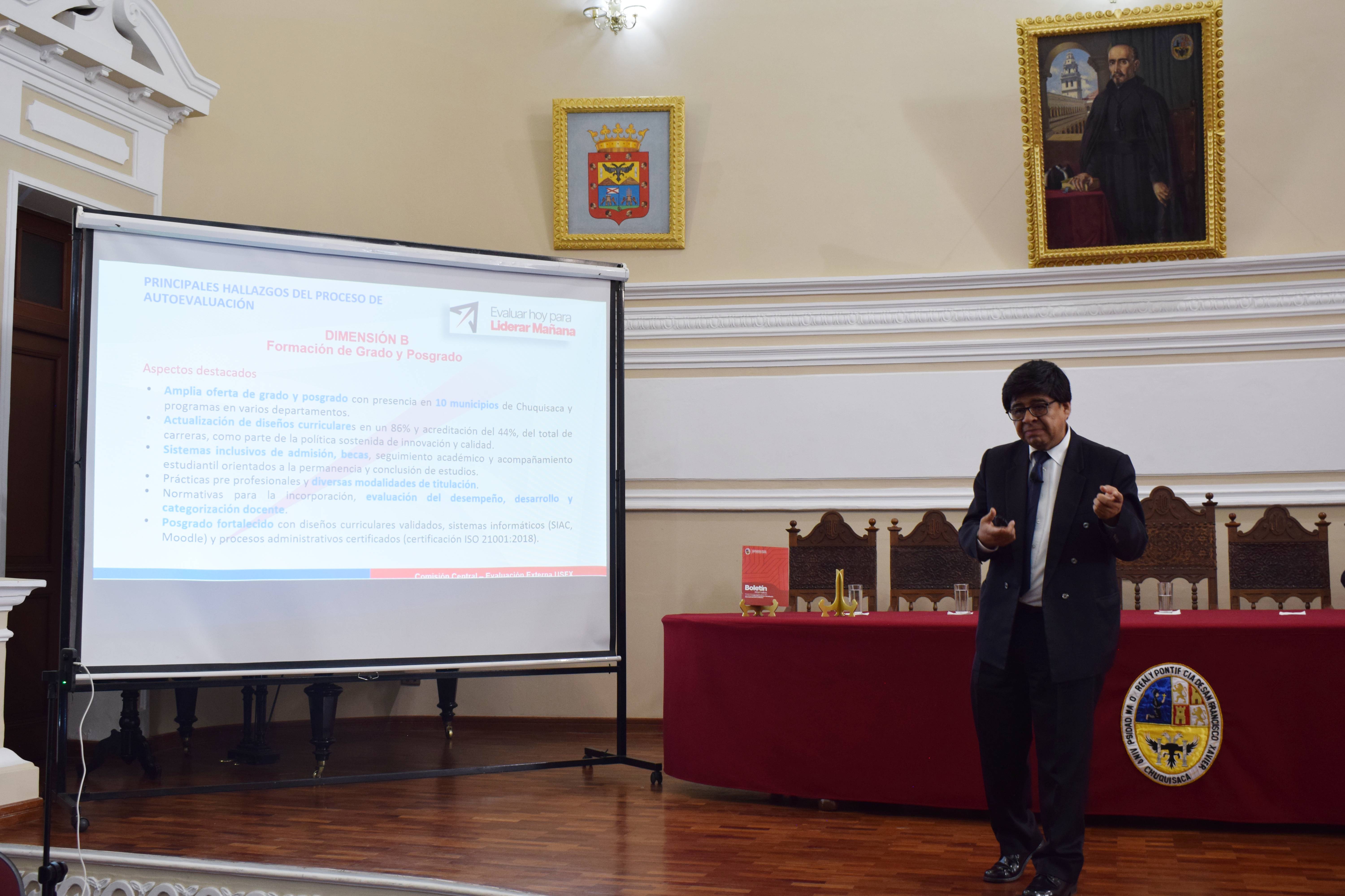 “Es la primera Universidad de Bolivia que asume el desafío de la evaluación externa para su acreditación a la UDUALC; sin embargo, lo más importante no es el certificado de acreditación, porque el informe que presente el grupo de pares evaluadores dará luces para ejecutar el plan de fortalecimiento, cuya aplicación permitirá a la Universidad estar a la par de otras instituciones de educación superior del continente; es decir, este proceso permitirá mejorar en lo académico, administrativo y en la pertinencia de nuestras acciones con relación a las necesidades de Chuquisaca y el país”, aseguró el vicerrector, al subrayar que este momento es histórico para la institución, cuyo beneficio es transversal en todas las áreas del desarrollo.